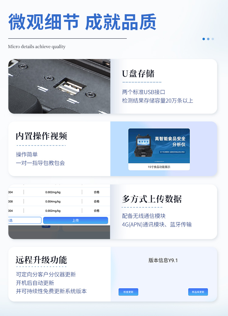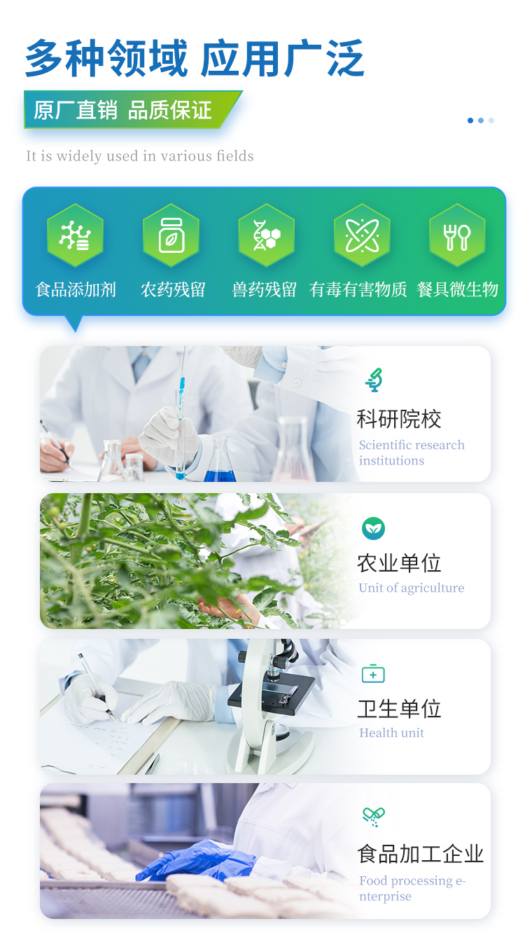 | 儀器采用臺式一體化系統(tǒng)檢測技術(shù),將分光光度模塊、新型農(nóng)殘檢測模塊、數(shù)字化管理模塊、無線通訊模塊高度集成于一體,支持檢測200種食品安全檢測項目,同時預(yù)留升級檢測方法。 | 儀器檢測模塊標(biāo)準(zhǔn)化、智能化,可隨意自由組合。檢測箱體內(nèi)置多個標(biāo)準(zhǔn)檢測單元,檢測模塊可以調(diào)整配置。 | 儀器采用全新安卓智能系統(tǒng),主控芯片采用 ARM Cortex-A7,RK3288/4核處理器,10.1寸高清液晶觸摸豎屏,更加**的UI交互界面,運(yùn)轉(zhuǎn)快捷;儀器配備無線通信模塊: 4G(APN)通訊模塊、Wifi模塊,藍(lán)牙傳輸,同時具有雙USB接口以及RJ45接口能以多種方式實現(xiàn)數(shù)據(jù)保存和數(shù)據(jù)傳輸功能。 | 創(chuàng)新檢測模式: | ★檢測通道:≥12通道;采用精密旋轉(zhuǎn)比色池設(shè)計,使用同芯片同光源校準(zhǔn)精度,解決不同光源之間的誤差值。1-12通道間誤差0.1%。(**號:ZL202022821055.2) | ★儀器具有自動識別比色皿檢測功能,即:將樣品比色皿放入儀器后,點擊樣品檢測,儀器自動識別比色皿進(jìn)行通道檢測。 | 進(jìn)口高精光源: | 高精度進(jìn)口四波長冷光源,通道配置 410、520、590、630nm 波長光源,一個光源芯片驅(qū)動一個光源,誤差極小,每臺設(shè)備單獨**校準(zhǔn)光源,**比對,同時參照四種不同波段光源全方位覆蓋市面上99%的農(nóng)殘食品項目檢測。 | 智能化操作系統(tǒng): | 便捷操作系統(tǒng):設(shè)備檢測時可在同一檢測界面自動對應(yīng)相關(guān)檢測通道一次性選擇1-12個樣品名稱,無須退出界面,節(jié)省操作時間。 | 數(shù)據(jù)集成系統(tǒng):設(shè)備首頁自動統(tǒng)計檢測數(shù)據(jù)包含:周檢測數(shù)據(jù)、月檢測數(shù)據(jù),全部檢測總數(shù)量,均包含檢測總數(shù),合格數(shù),不合格數(shù),以及相關(guān)柱形分析圖,對各項檢測數(shù)據(jù)清晰掌握,無需電腦查詢,更加快捷直觀。 | 項目預(yù)設(shè)系統(tǒng):支持添加單個及多個相同或不相同的任務(wù)預(yù)設(shè),一鍵快速調(diào)取,每一個任務(wù)分別可以設(shè)置不同的樣品、批次、編號、來源、備注、抽樣信息、檢測信息、受檢信息、復(fù)核信息等更多信息。無縫鏈接平臺和APP實時查看下發(fā)任務(wù)。 | 數(shù)據(jù)監(jiān)管系統(tǒng):同步對接監(jiān)管平臺,數(shù)據(jù)可局域網(wǎng)和互聯(lián)網(wǎng)數(shù)據(jù)上傳,檢測結(jié)果可選擇直接傳至食品安全監(jiān)管平臺。集成OSS輸出存儲服務(wù)、區(qū)分設(shè)備定向管理應(yīng)用,進(jìn)行區(qū)域食品安全監(jiān)管及大數(shù)據(jù)分析處理與數(shù)據(jù)統(tǒng)計,檢測區(qū)域食品安全長短期動態(tài),達(dá)到食品安全問題預(yù)估、預(yù)警。 | 自定義打印系統(tǒng):內(nèi)置全新打印系統(tǒng),新創(chuàng)自定義打印方式,可按需靈活設(shè)置開啟或關(guān)閉:產(chǎn)品合格證(國家農(nóng)業(yè)部標(biāo)準(zhǔn)要求),二維碼,抽樣信息、檢測信息,受檢信息、復(fù)核信息、抽樣日期、檢測日期等信息的打印。 | 系統(tǒng)遠(yuǎn)程更新功能:可定向分客戶分儀器更新系統(tǒng),按照不同客戶后期實際需求添加項目,無需機(jī)器返廠,即可遠(yuǎn)程實時升級全新系統(tǒng),節(jié)省時間成本及避免運(yùn)輸造成設(shè)備損壞。 | 儀器主機(jī)采用一體化防水、抗壓、防撞擊、防腐蝕箱體設(shè)計,同時配備交直流供電,可連接車載電源,可選配大容量充電鋰電池,滿足現(xiàn)場野外檢測需求。 | 安全證書,放心保障:儀器具有中國計量科學(xué)研究院校準(zhǔn)證書,**認(rèn)證。 |