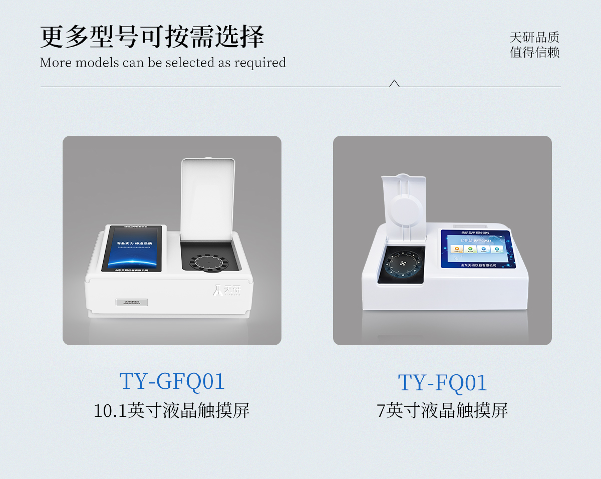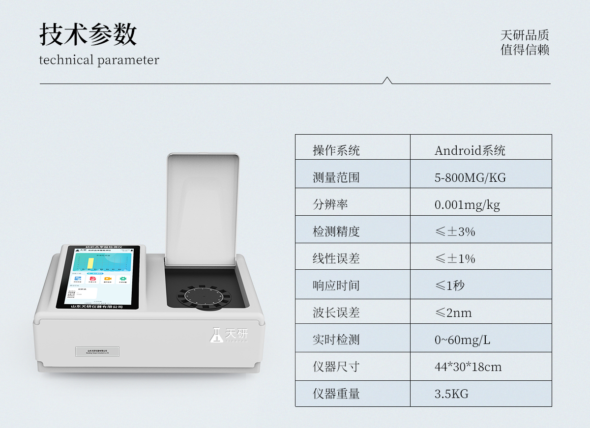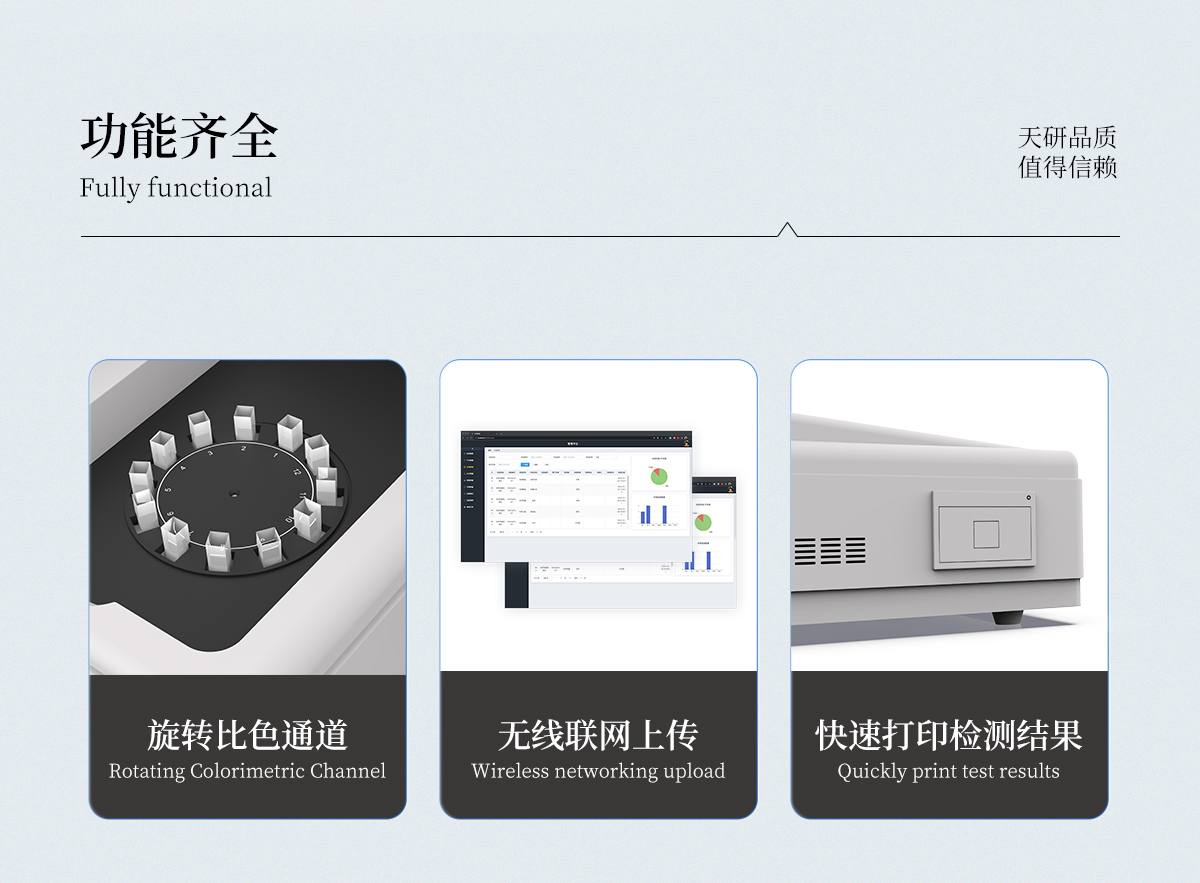| 1、智能**且方便 | ①智能芯片:主控芯片采用ARM Cortex-A7,RK3288/4核處理器,搭配安卓智能操作系統(tǒng),集實驗操作,分析結(jié)果,打印報告等功能于一體,使用方便,性能更強。 | ②大屏顯示:采用10.1英寸液晶觸摸屏,單機即可操作,無需連接外部顯示或控制器。 | ③多樣同檢:儀器具有12個檢測通道,可同時一次性檢測11個樣品,效率更高。 | ④工作預(yù)設(shè):具有任務(wù)預(yù)設(shè)模塊,一鍵提前預(yù)設(shè)樣品所有信息內(nèi)容。來樣時可直接檢測,同時可多次調(diào)取。 | ⑤數(shù)據(jù)分析:設(shè)備首頁自動匯總分析數(shù)據(jù),并繪制柱形分析圖,各項檢測數(shù)據(jù)一目了然,快捷直觀。 | ⑥高度集成:模塊高度集合,將分光光度模塊、數(shù)字化管理模塊、無線通訊模塊集成于一體??蓪z測結(jié)果進(jìn)行分析,直接上傳至數(shù)據(jù)平臺,實現(xiàn)數(shù)據(jù)共享,方便后期進(jìn)行數(shù)據(jù)分析與統(tǒng)計。 | ⑦遠(yuǎn)程升級:儀器具備遠(yuǎn)程升級功能,可遠(yuǎn)程升級程序,無需返廠,并可持續(xù)性免費更新系統(tǒng)版本,降低成本及運輸損耗風(fēng)險。 | 2、檢測精準(zhǔn)且直觀 | ①**技術(shù):精密旋轉(zhuǎn)比色池,使用同芯片同光源校準(zhǔn)精度,解決不同光源之間存在波長誤差的問題,更加準(zhǔn)確**。 | ②結(jié)果直觀:儀器自動對檢測結(jié)果與國標(biāo)限量值進(jìn)行對比,自動判定結(jié)果是否合格,結(jié)果更直觀。 | 3、功能強大且實用 | ①存儲功能:設(shè)備可以存儲數(shù)據(jù)100000組,可在屏幕上直觀查看歷史數(shù)據(jù),可導(dǎo)出數(shù)據(jù)。 | ②打印功能:設(shè)備自帶打印功能,可對樣品信息及檢測結(jié)果無限次隨意打印。 | ③全新方式:新創(chuàng)自定義打印方式,可按需靈活勾選控制:二維碼,抽樣信息、檢測信息,受檢信息、復(fù)核信息、抽樣日期、檢測日期等信息的打印 | ④多重編輯:樣品信息可多重編輯,可以對每個通道屬性和樣品信息單獨進(jìn)行編輯,例如樣品信息、抽樣信息、檢測信息,受檢信息、復(fù)核信息、抽樣日期、檢測日期等信息等。 | ⑤雙語設(shè)計:全中文/英文操作菜單,簡單實用,適用于不同用戶的需求。 |