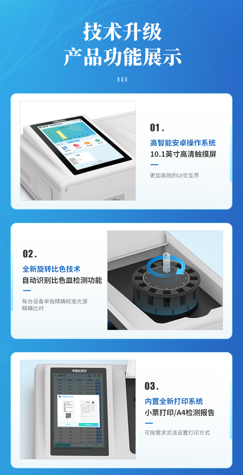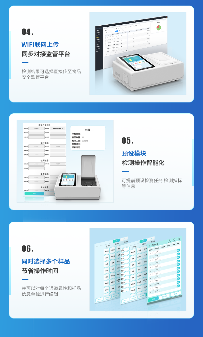 | 儀器采用臺式一體化系統(tǒng)檢測技術(shù),將分光光度模塊、新型農(nóng)殘檢測模塊、數(shù)字化管理模塊、無線通訊模塊高度集成于一體,支持檢測200種食品安全檢測項目,同時預(yù)留升級檢測方法。 | 儀器檢測模塊標(biāo)準(zhǔn)化、智能化,可隨意自由組合。檢測箱體內(nèi)置多個標(biāo)準(zhǔn)檢測單元,檢測模塊可以調(diào)整配置。 | 儀器采用全新安卓智能系統(tǒng),主控芯片采用 ARM Cortex-A7,RK3288/4核處理器,10.1寸高清液晶觸摸豎屏,更加**的UI交互界面,運轉(zhuǎn)快捷;儀器配備無線通信模塊: 4G(APN)通訊模塊、Wifi模塊,藍(lán)牙傳輸,同時具有雙USB接口以及RJ45接口能以多種方式實現(xiàn)數(shù)據(jù)保存和數(shù)據(jù)傳輸功能。 | 創(chuàng)新檢測模式: | ★檢測通道:≥12通道;采用精密旋轉(zhuǎn)比色池設(shè)計,使用同芯片同光源校準(zhǔn)精度,解決不同光源之間的誤差值。1-12通道間誤差0.1%。(**號:ZL202022821055.2) | ★儀器具有自動識別比色皿檢測功能,即:將樣品比色皿放入儀器后,點擊樣品檢測,儀器自動識別比色皿進(jìn)行通道檢測。 | 進(jìn)口高精光源: | 高精度進(jìn)口四波長冷光源,通道配置 410、520、590、630nm 波長光源,一個光源芯片驅(qū)動一個光源,誤差極小,每臺設(shè)備單獨**校準(zhǔn)光源,**比對,同時參照四種不同波段光源全方位覆蓋市面上99%的農(nóng)殘食品項目檢測。 | 智能化操作系統(tǒng): | 便捷操作系統(tǒng):設(shè)備檢測時可在同一檢測界面自動對應(yīng)相關(guān)檢測通道一次性選擇1-12個樣品名稱,無須退出界面,節(jié)省操作時間。 | 數(shù)據(jù)集成系統(tǒng):設(shè)備首頁自動統(tǒng)計檢測數(shù)據(jù)包含:周檢測數(shù)據(jù)、月檢測數(shù)據(jù),全部檢測總數(shù)量,均包含檢測總數(shù),合格數(shù),不合格數(shù),以及相關(guān)柱形分析圖,對各項檢測數(shù)據(jù)清晰掌握,無需電腦查詢,更加快捷直觀。 | 項目預(yù)設(shè)系統(tǒng):支持添加單個及多個相同或不相同的任務(wù)預(yù)設(shè),一鍵快速調(diào)取,每一個任務(wù)分別可以設(shè)置不同的樣品、批次、編號、來源、備注、抽樣信息、檢測信息、受檢信息、復(fù)核信息等更多信息。無縫鏈接平臺和APP實時查看下發(fā)任務(wù)。 | 數(shù)據(jù)監(jiān)管系統(tǒng):同步對接監(jiān)管平臺,數(shù)據(jù)可局域網(wǎng)和互聯(lián)網(wǎng)數(shù)據(jù)上傳,檢測結(jié)果可選擇直接傳至食品安全監(jiān)管平臺。集成OSS輸出存儲服務(wù)、區(qū)分設(shè)備定向管理應(yīng)用,進(jìn)行區(qū)域食品安全監(jiān)管及大數(shù)據(jù)分析處理與數(shù)據(jù)統(tǒng)計,檢測區(qū)域食品安全長短期動態(tài),達(dá)到食品安全問題預(yù)估、預(yù)警。 | 自定義打印系統(tǒng):內(nèi)置全新打印系統(tǒng),新創(chuàng)自定義打印方式,可按需靈活設(shè)置開啟或關(guān)閉:產(chǎn)品合格證(國家農(nóng)業(yè)部標(biāo)準(zhǔn)要求),二維碼,抽樣信息、檢測信息,受檢信息、復(fù)核信息、抽樣日期、檢測日期等信息的打印。 | 系統(tǒng)遠(yuǎn)程更新功能:可定向分客戶分儀器更新系統(tǒng),按照不同客戶后期實際需求添加項目,無需機器返廠,即可遠(yuǎn)程實時升級全新系統(tǒng),節(jié)省時間成本及避免運輸造成設(shè)備損壞。 | 儀器主機采用一體化防水、抗壓、防撞擊、防腐蝕箱體設(shè)計,同時配備交直流供電,可連接車載電源,可選配大容量充電鋰電池,滿足現(xiàn)場野外檢測需求。 | 安全證書,放心保障:儀器具有中國計量科學(xué)研究院校準(zhǔn)證書,**認(rèn)證。 |